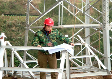 圖四:四川省強(qiáng)波電力工程有限公司在2005年承建的220KV大方變電站—110KV楊家橋變電站送電線路工程,圖為該工程項(xiàng)目經(jīng)理在現(xiàn)場親自指揮N5號(hào)鐵塔組立。
